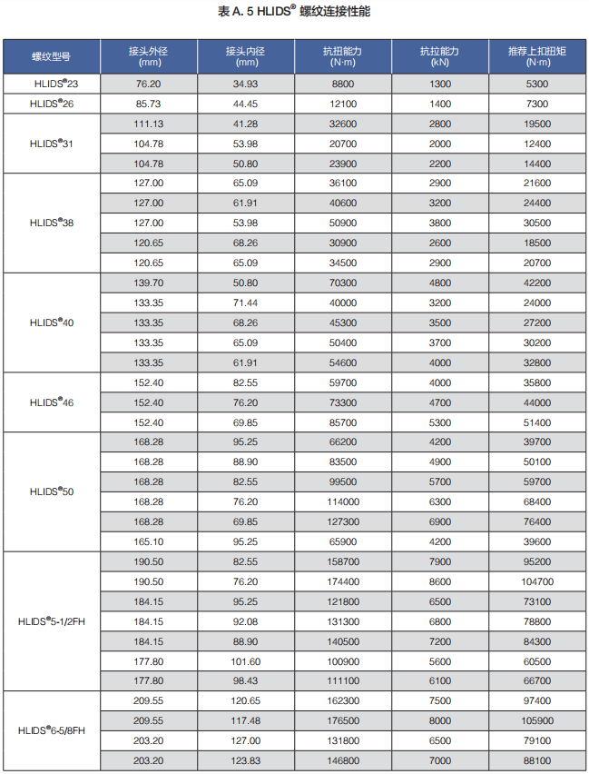 (a)HLIDS® 系列包括 HLIDS®23、HLIDS®26、HLIDS®31、HLIDS®38、HLIDS®40、HLIDS®46、HLIDS®50、HLIDS®5 1/2FH 和 HLIDS®6 5/8FH 等規(guī)格,適用于 2 3/8"-6 5/8" 所有API 標(biāo)準(zhǔn)鋼級(jí)和規(guī)格的鉆桿。